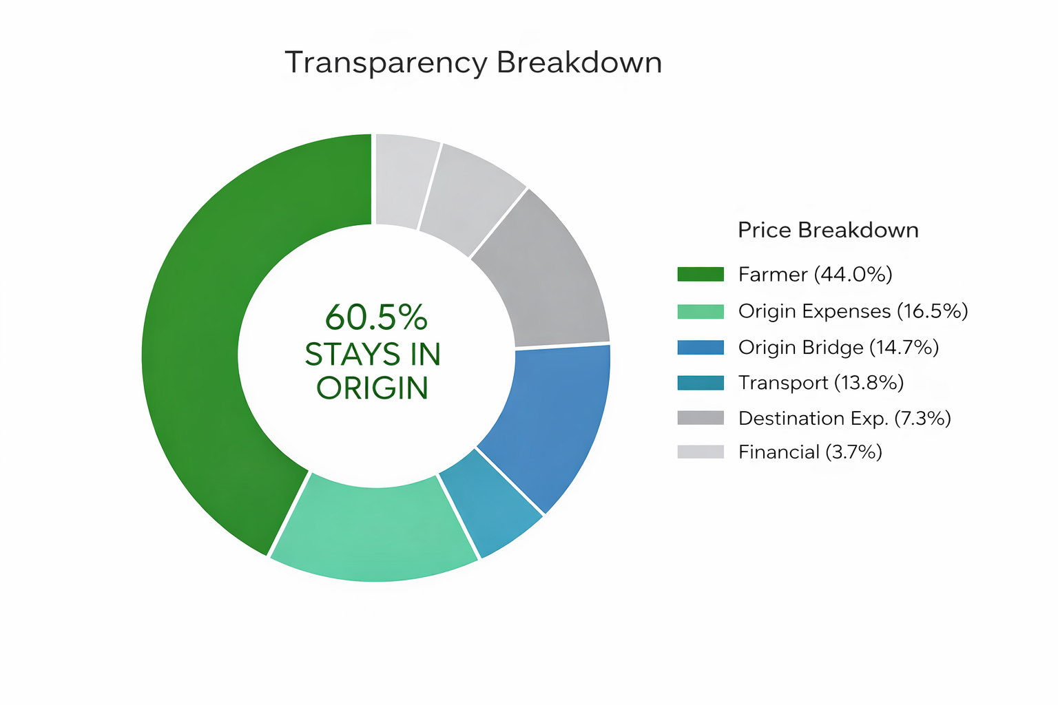 As you can see, over 60% of the value stays in the origin. This isn’t philanthropy; it’s a sustainable business model that guarantees quality for you and a fair living for our partners.